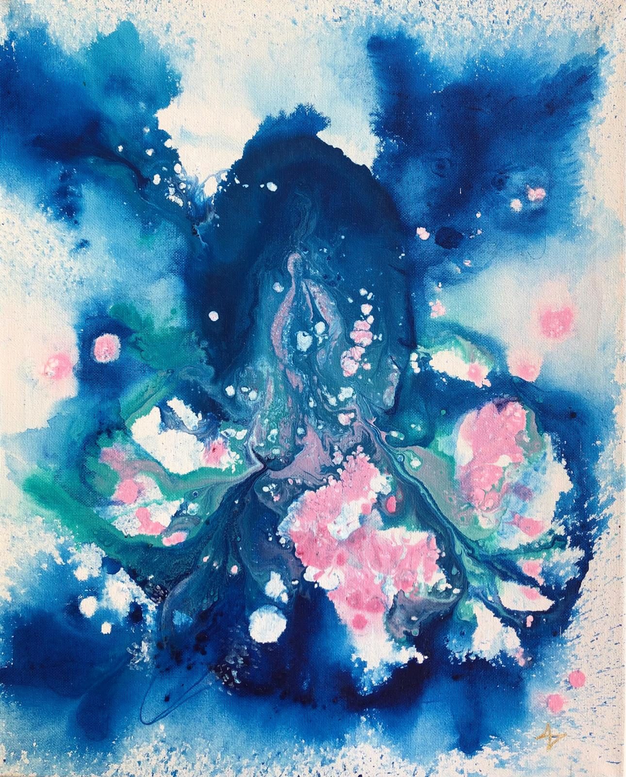 Werken in opdracht met een open thema is leuk en spannend. Zij kan gaan invoelen wat hier mag ontstaan, middels de verf te laten stromen en daarin weer voorzichtig gaan werken. Zo ontstaat een persoonlijk kunstwerk, ook wel Soul-Art genoemd.