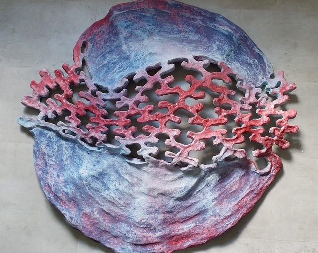 Ik maak reliëfs van door mijzelf gerecyclede papierpulp, die ik bewerk met acrylverf.