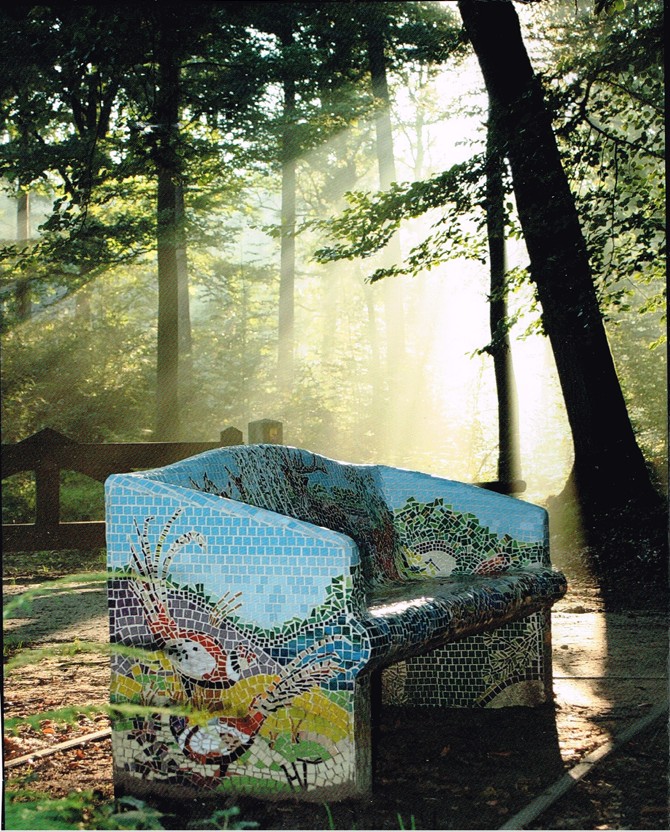 De mozaïekbank (zie foto) was een opdracht van de gemeente Ermelo en staat aan de rand van het bos aan de Drieërweg.
