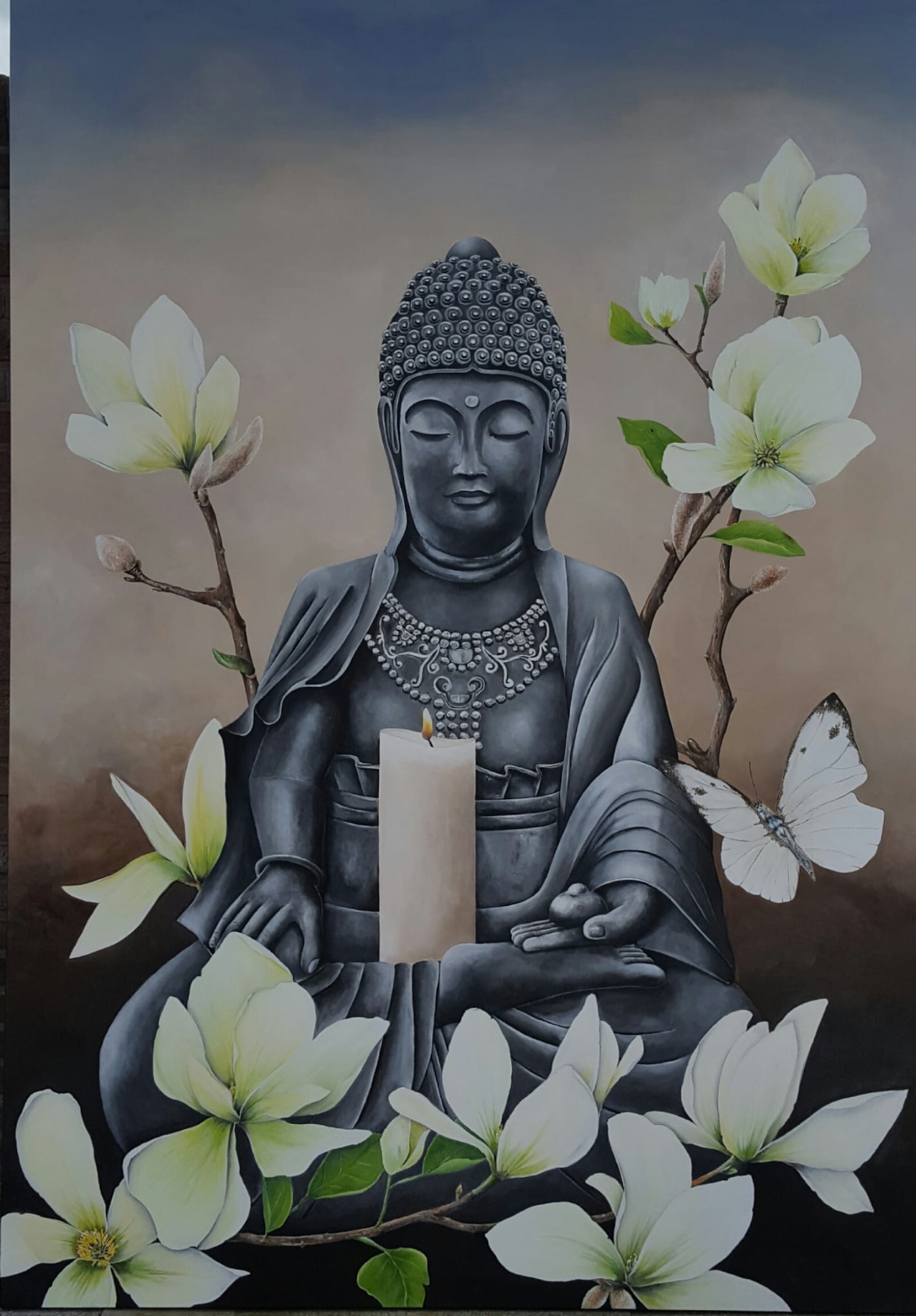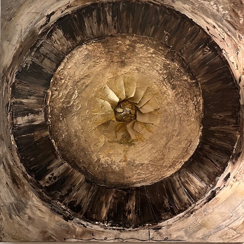 Dit werk draagt een stukje van mijn ziel. Het is ontstaan met verschillende materialen en talloze uren van toewijding. Een reis door geboorte, verdriet en stille veerkracht. Het craquelé (kleine barstjes) toont de littekens van het leven – rauw, kwetsbaar en eerlijk.